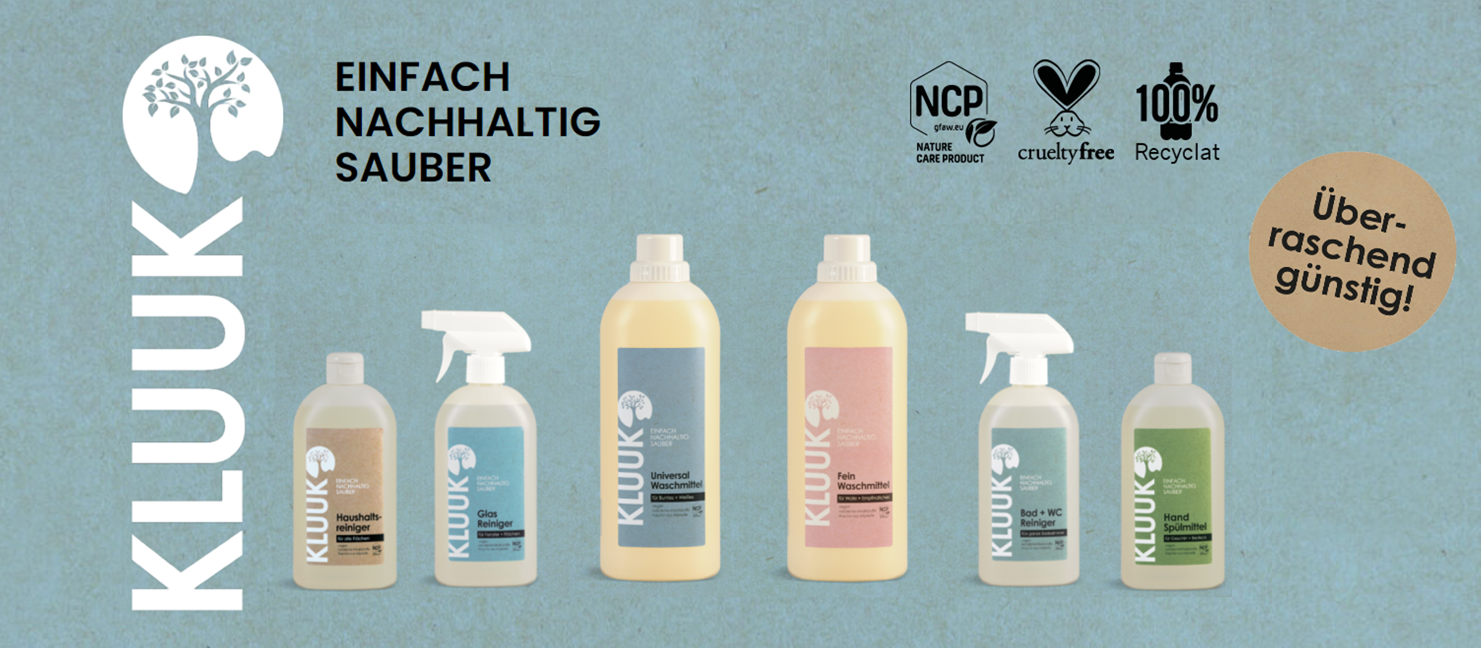 Klamotten, Wohnung, Geschirr und Küche, Bad, WC – alles wird schmutzig, keiner macht gern sauber. Aber wenn schon, denn schon: Mit KLUUK wird alles einfach nachhaltig sauber. KLUUK sind ehrliche, ökologische Produkte ohne überflüssigen Schnickschnack.